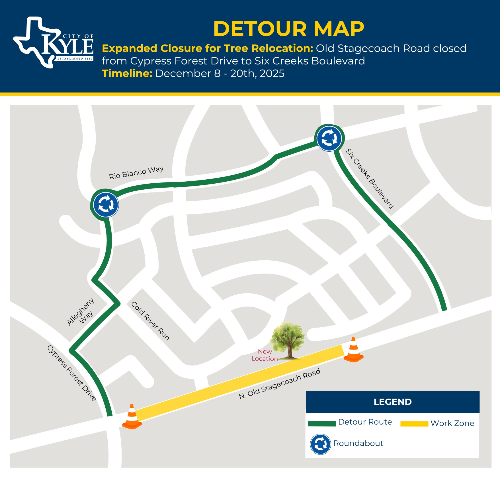 Detour Route: Cypress Forest Drive → Allegheny Way → Cold River Run → Three Forks DriveExpanded Closure for Tree Relocation: December 8 – December 20, 2025