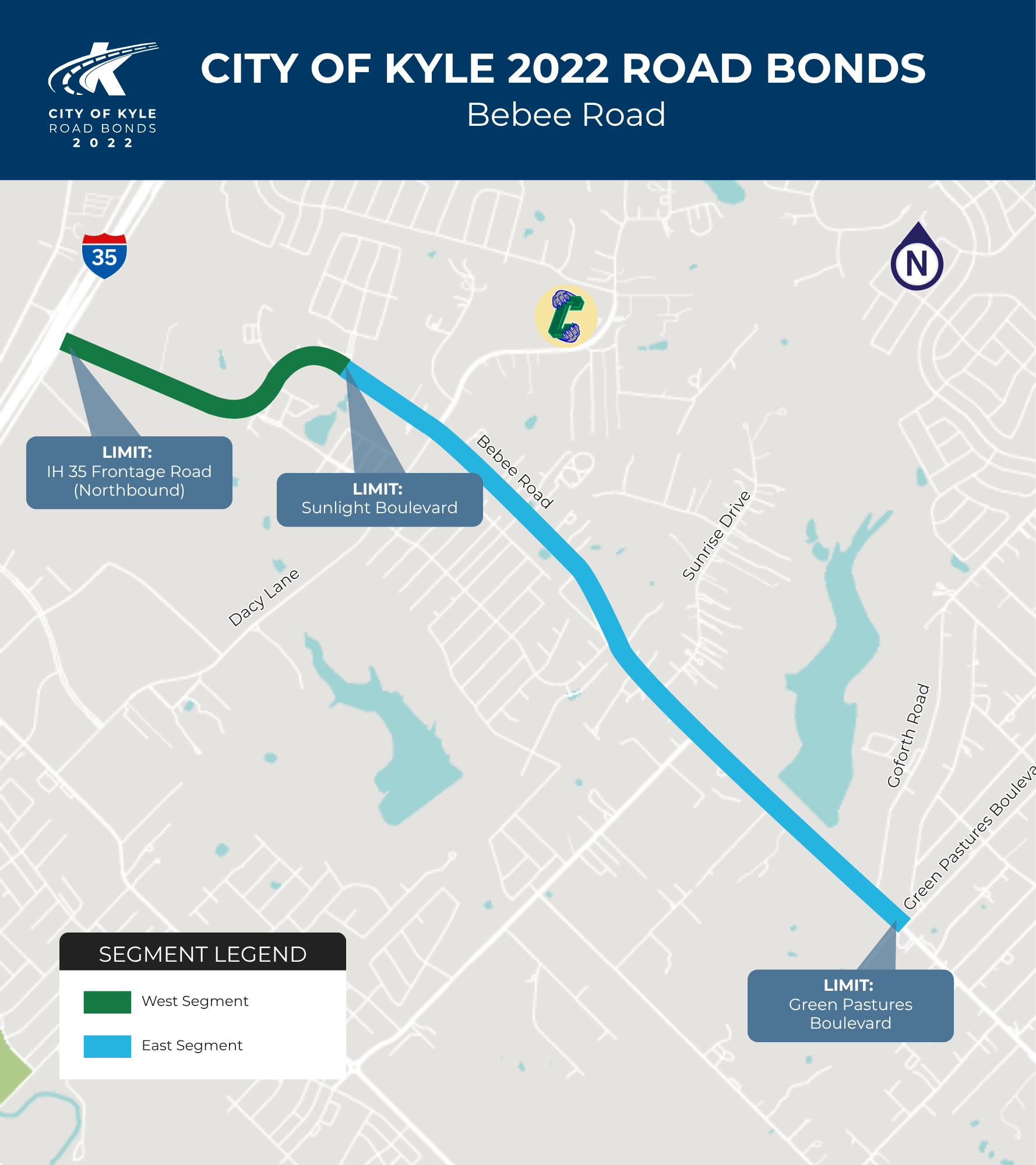 West segment: Under construction, this project will realign the sharp curves and add capacity to a 1-mile stretch of Bebee Road between northbound frontage road of I-35 and Sunlight Boulevard with a roundabout at the intersection of the Kohlers Crossing to Seton Parkway extension.