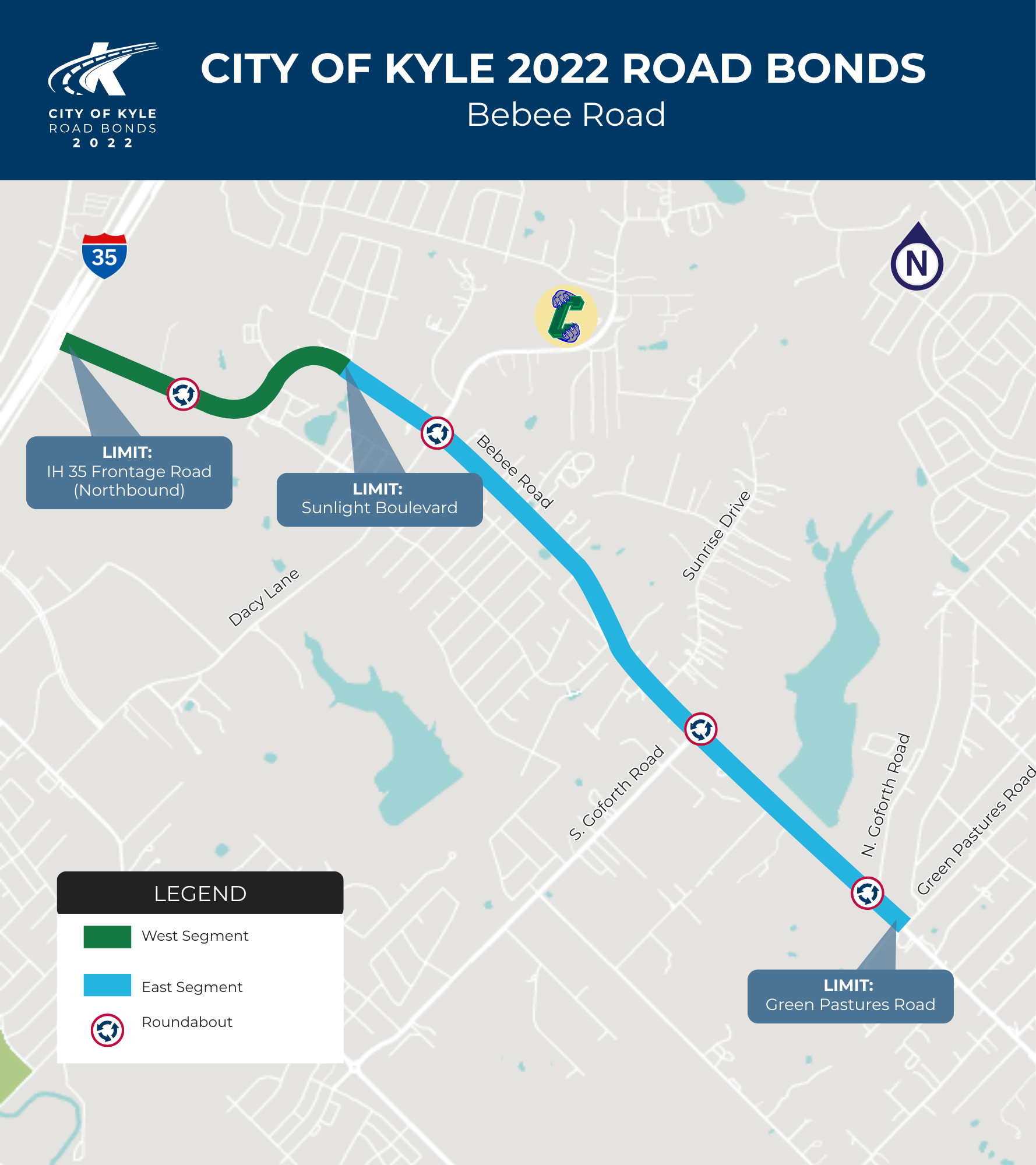 East segment: Approximately 2.1 miles of a new four-lane minor arterial roadway will be constructed from Sunlight Boulevard to east of Green Pastures Road, along with new roundabouts at the following intersections: Bebee Road & Dacy Lane, Bebee Road & Goforth South, and Bebee Road & Goforth North.