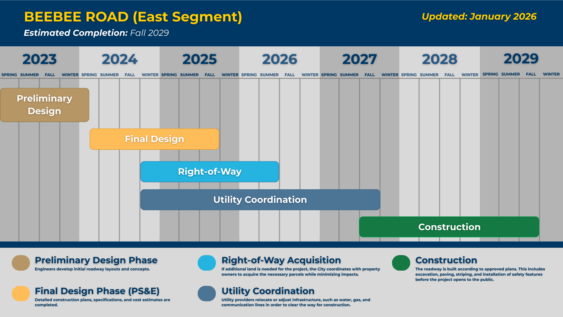 Final Design in progress. Construction to begin Fall 2027 and complete in Fall 2029