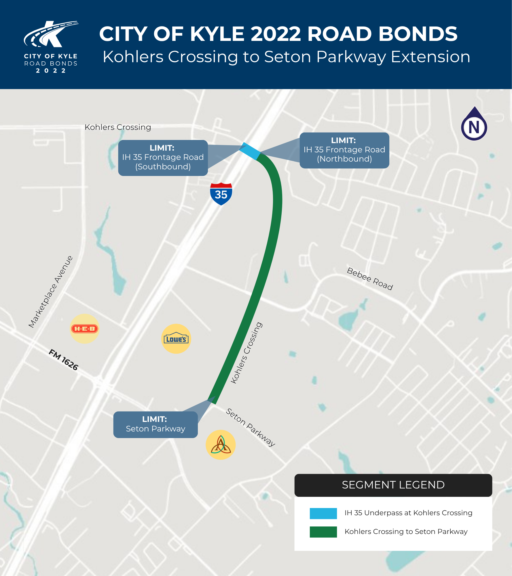This project will extend Seton Parkway to connect with Kohlers Crossing, creating a new five-lane underpass beneath I-35. The work will be completed in two segments: