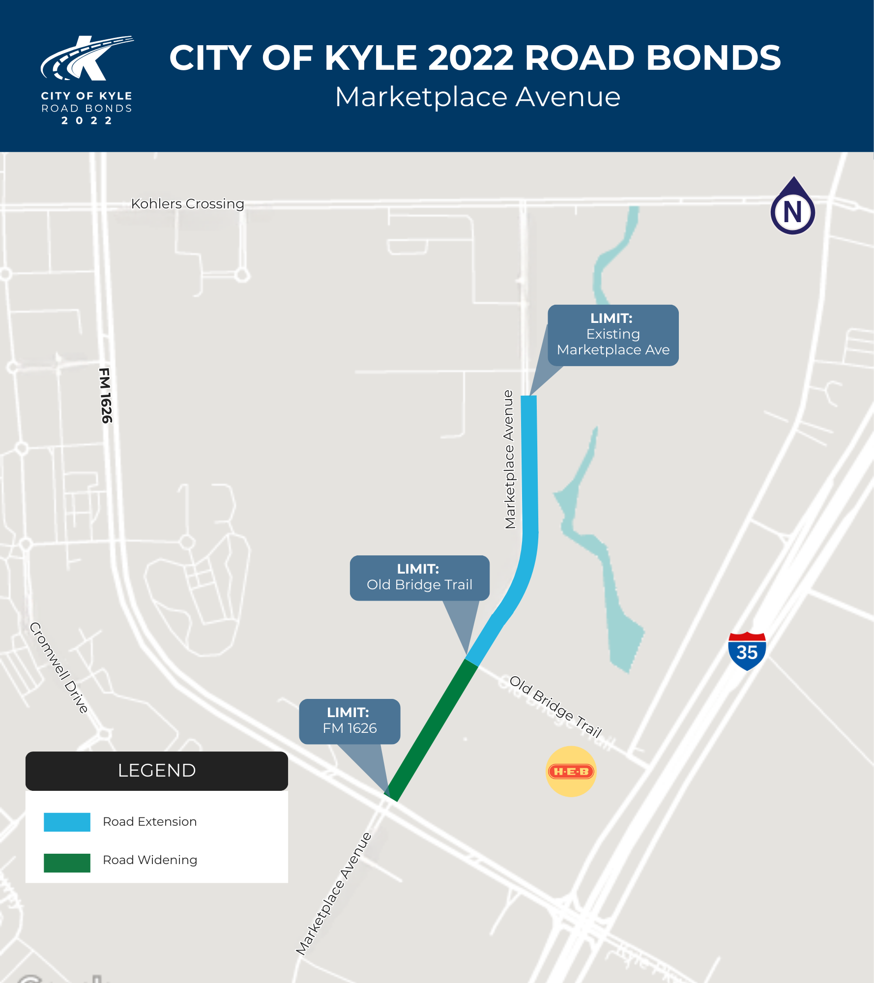 Location: Extends from FM 1626 through the existing Marketplace Ave. segment to Old Bridge Trail and Kohlers Crossing