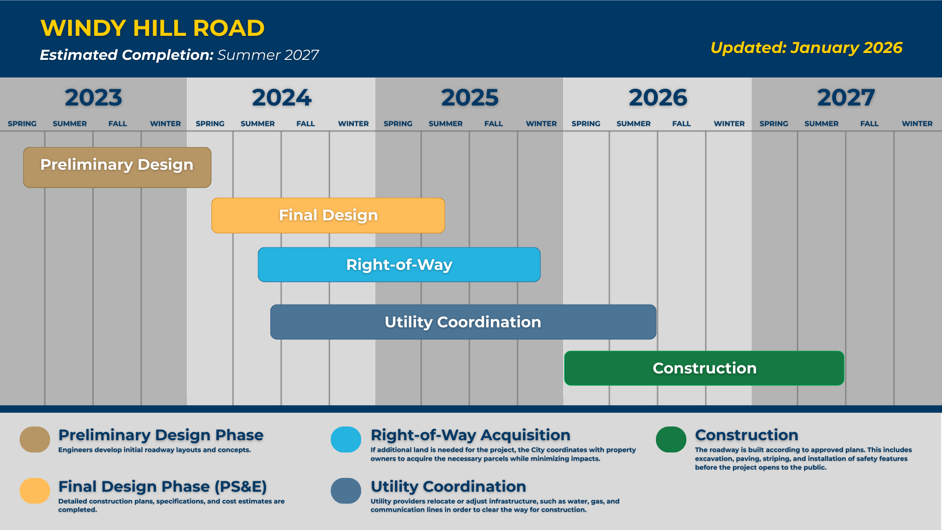 Smith Contracting has been selected to construct the project, and on February 17, 2026, the City Council authorized the City Manager to negotiate and execute a construction contract. The right-of-way phase is expected to wrap up by April 2026.